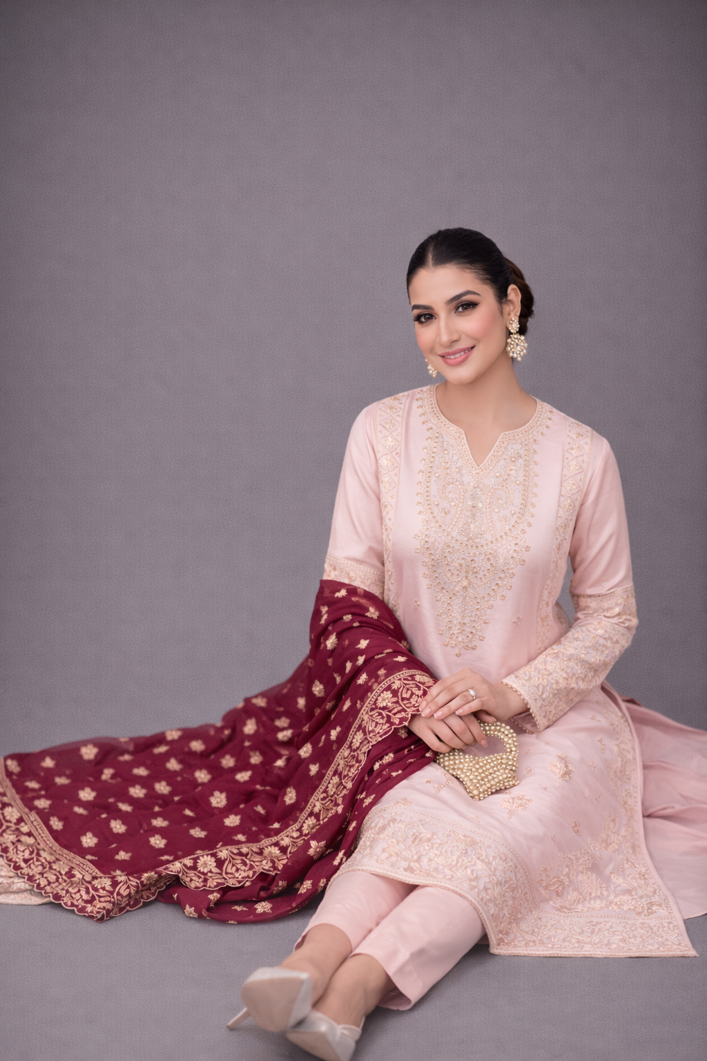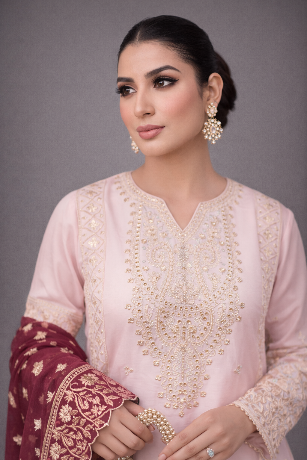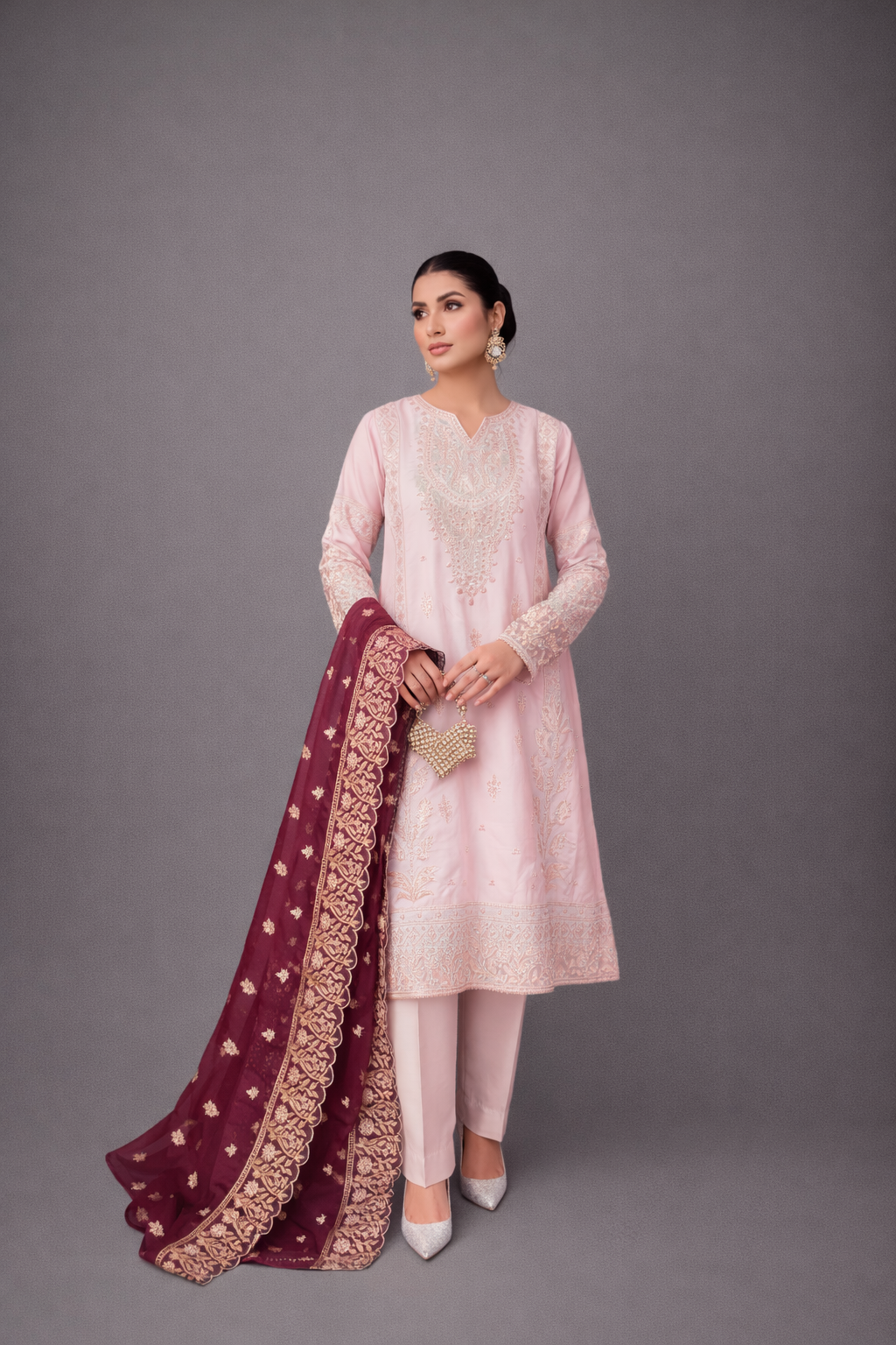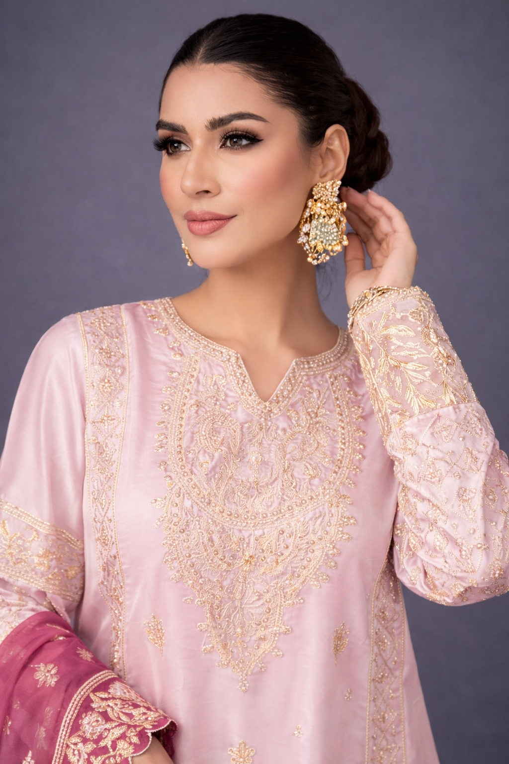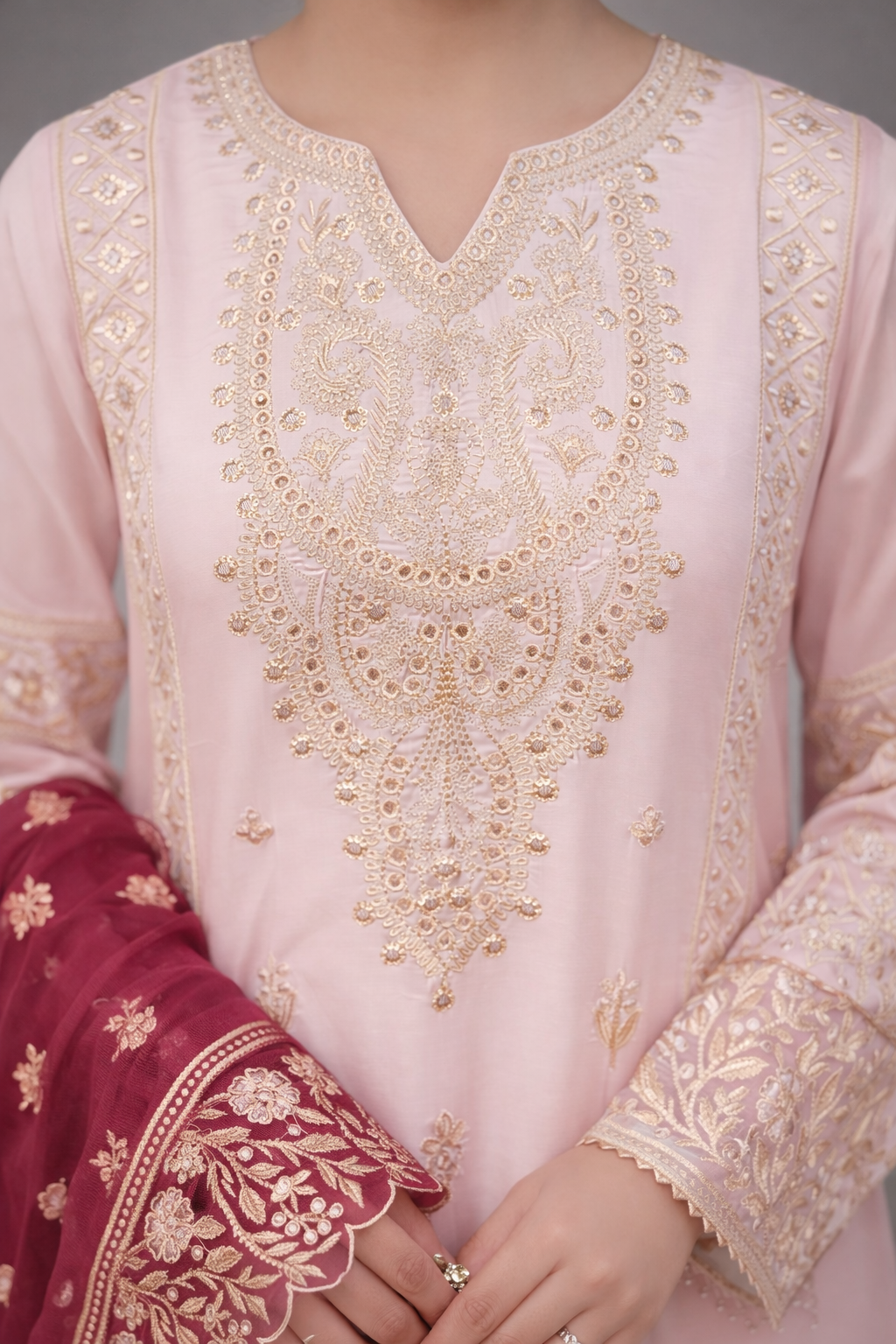 Paired with a graceful organza dupatta adorned with original embroidery, this ensemble is ideal for festive celebrations and semi-formal occasions. Available stitched or in custom sizing, Taslima Pink drapes effortlessly, radiating refined femininity and understated charm.