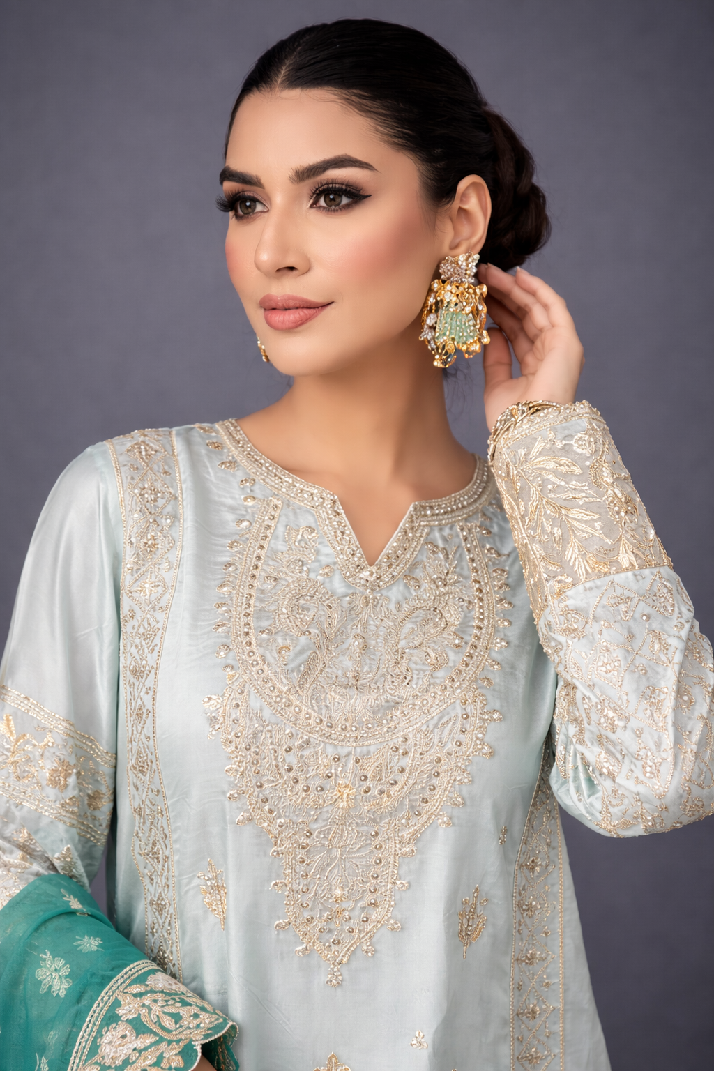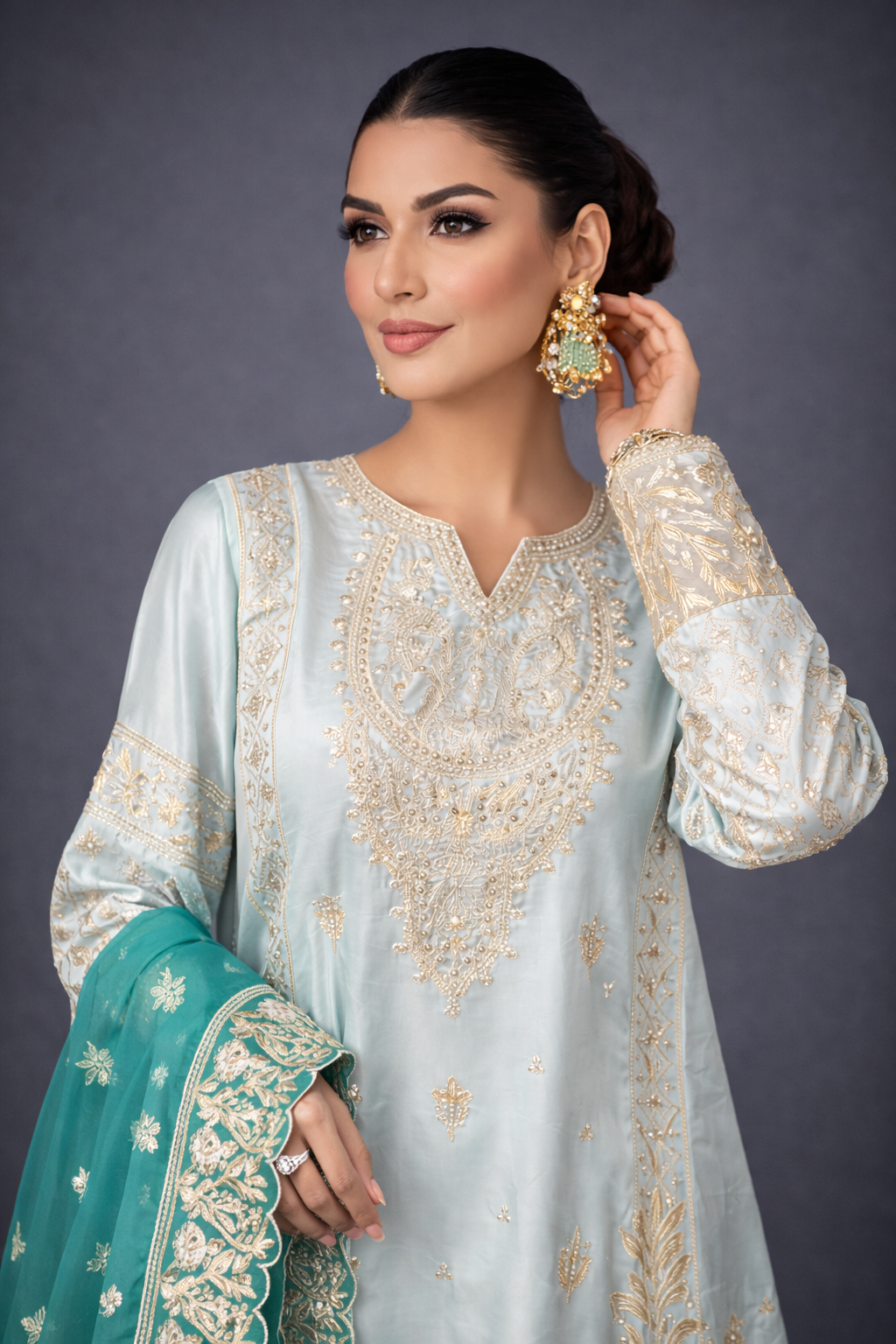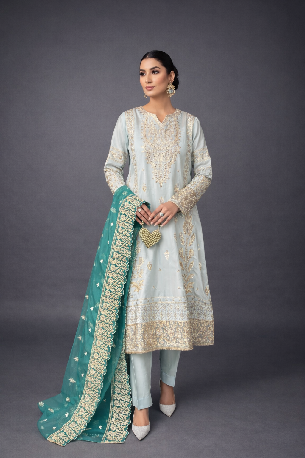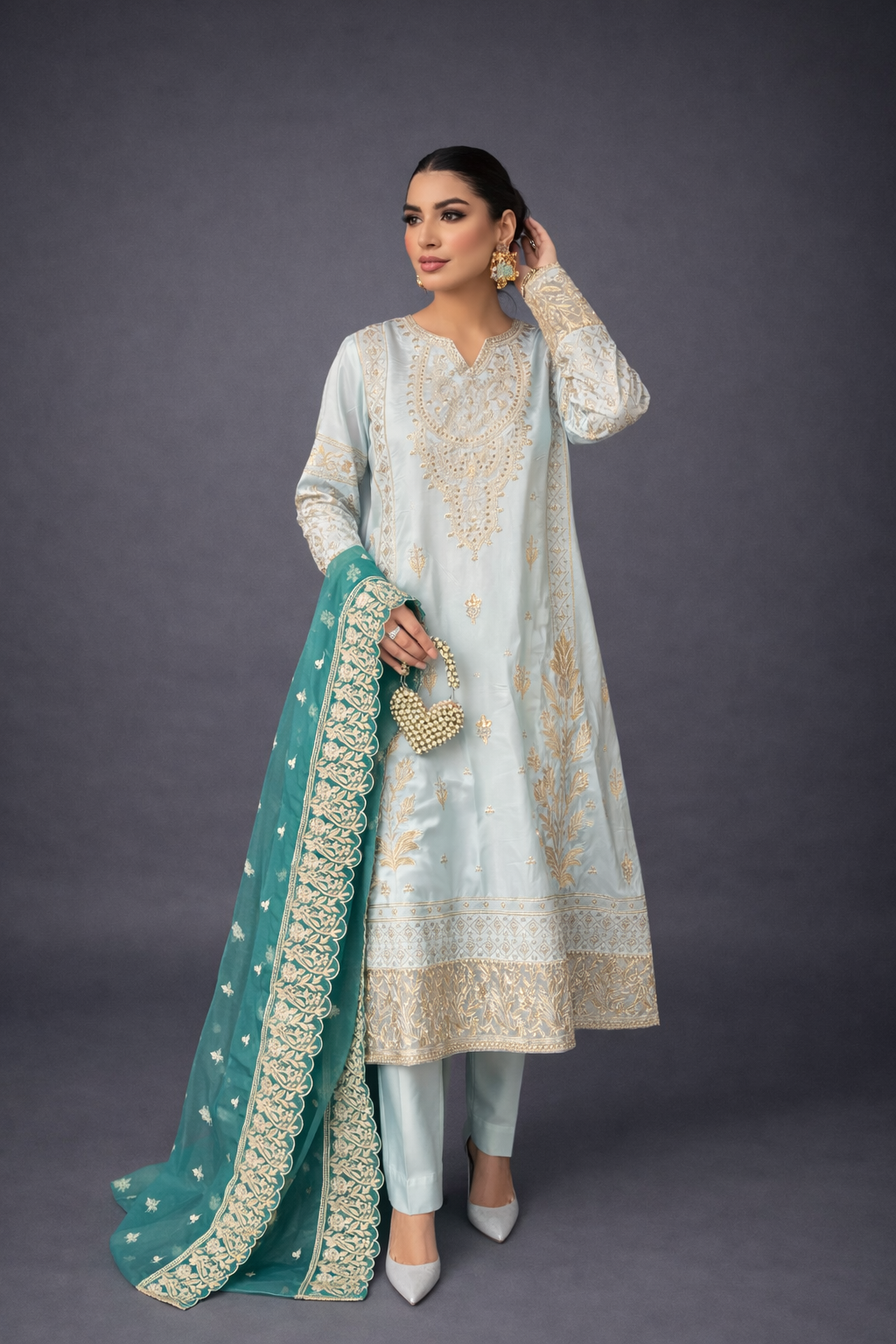Paired with a graceful organza dupatta adorned with original embroidery, this ensemble is ideal for festive celebrations and semi-formal occasions. Available stitched or in custom sizing, Taslima Pink drapes effortlessly, radiating refined femininity and understated charm.