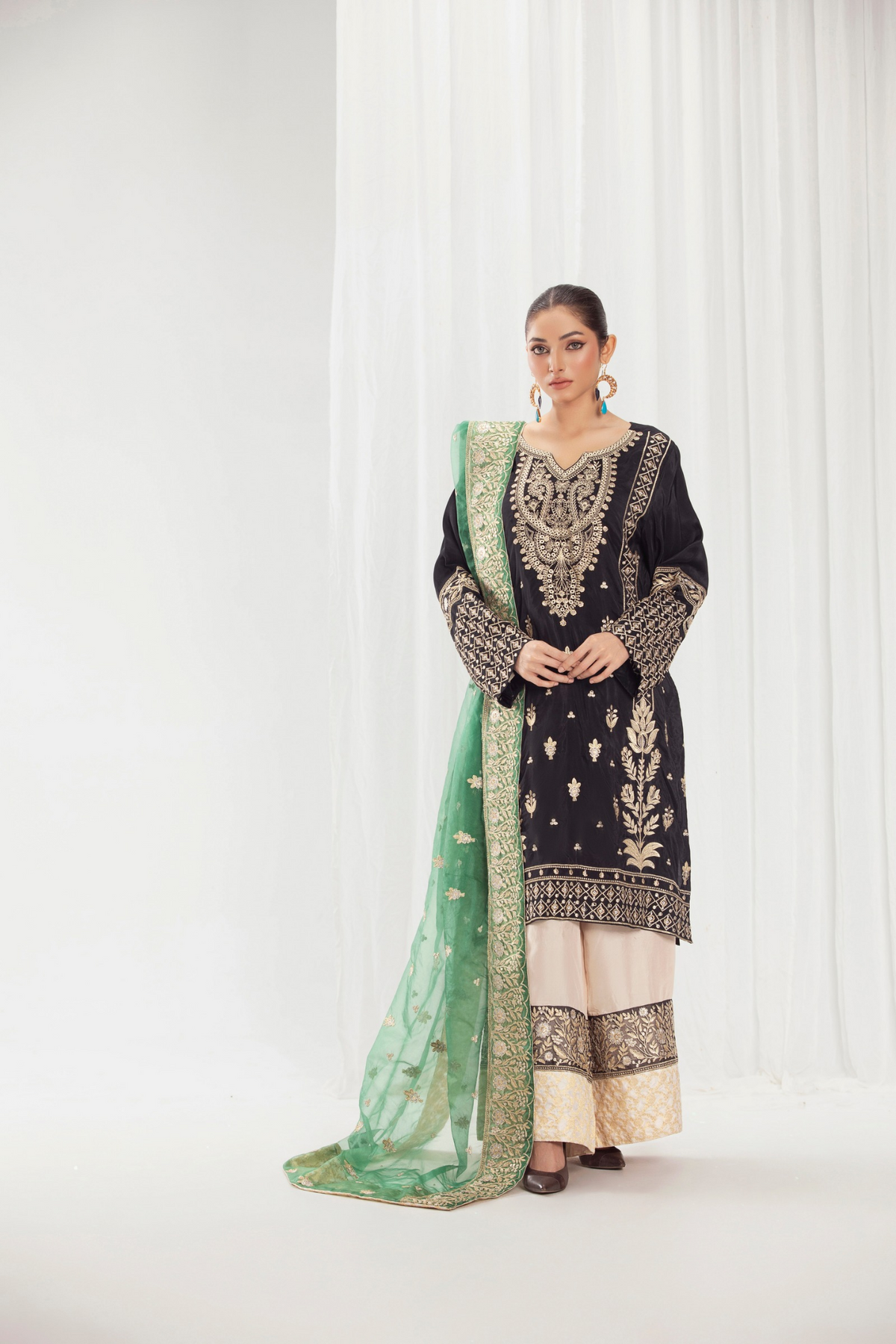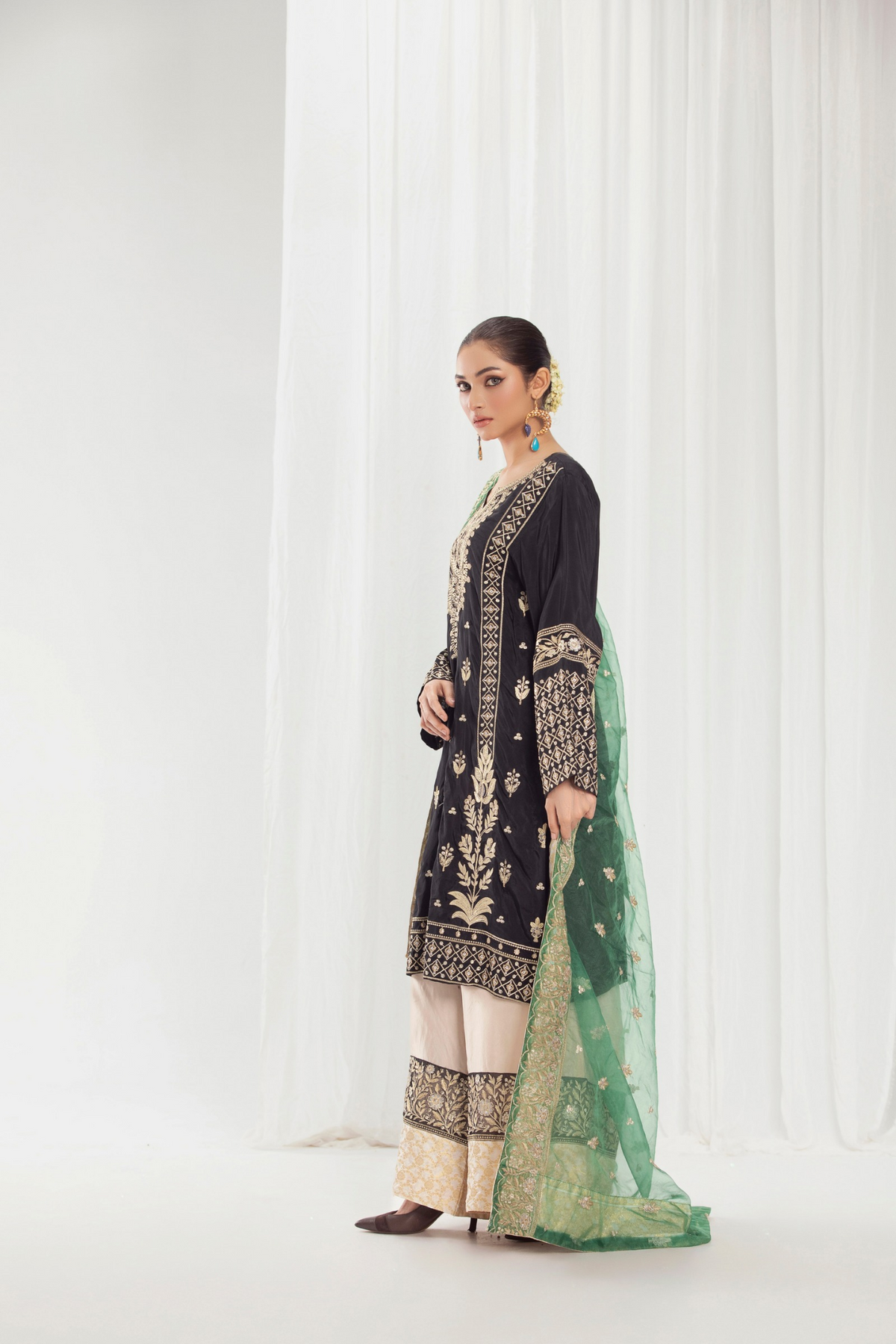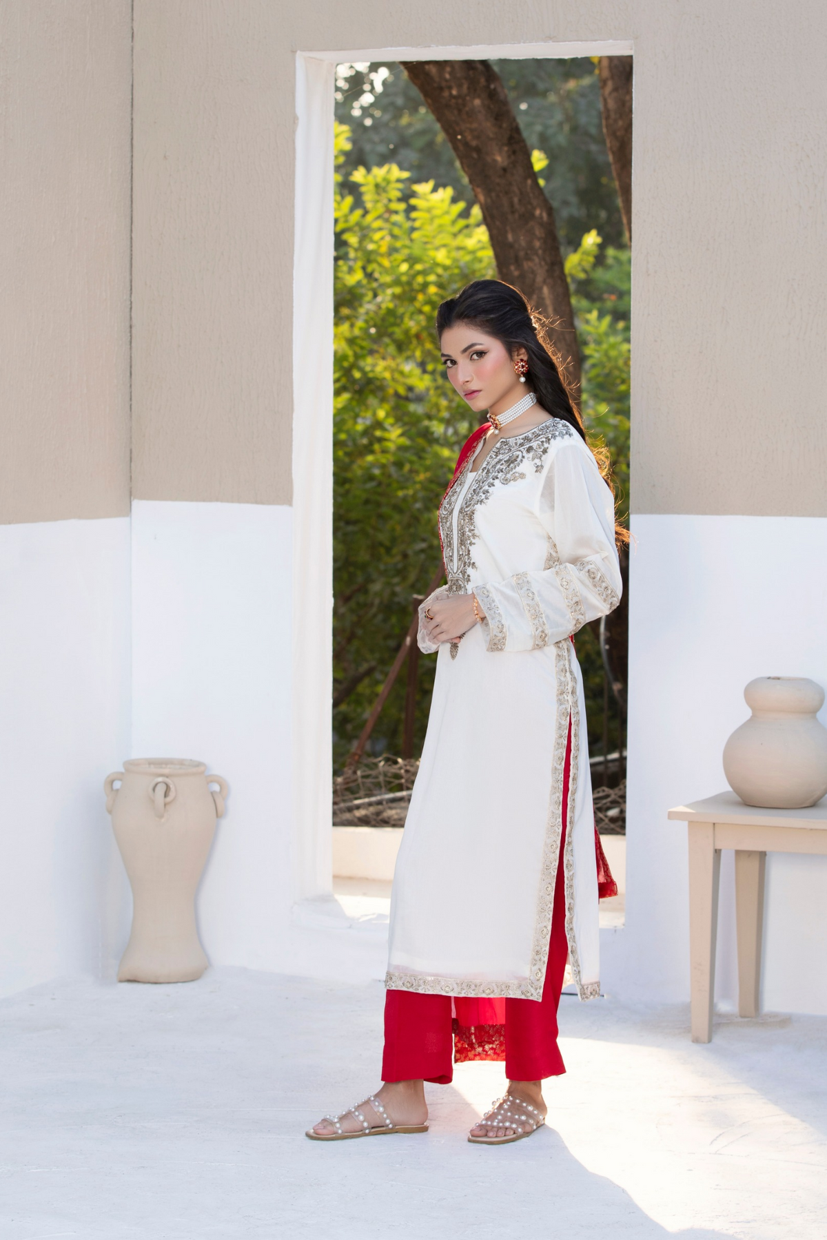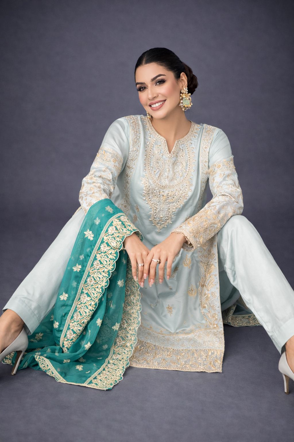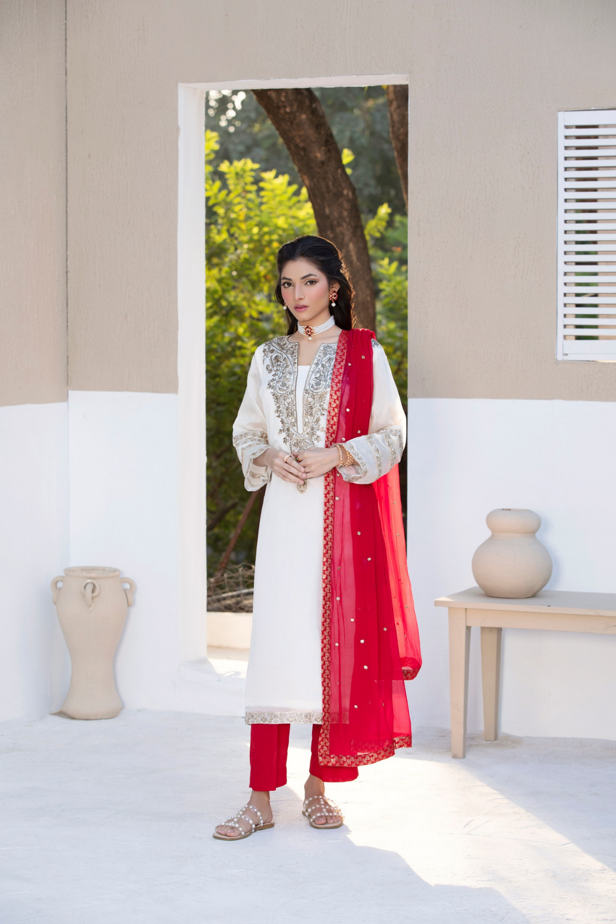 Paired with a graceful organza dupatta adorned with original embroidery, this ensemble is ideal for festive celebrations and semi-formal occasions. Available stitched or in custom sizing, Taslima Pink drapes effortlessly, radiating refined femininity and understated charm.