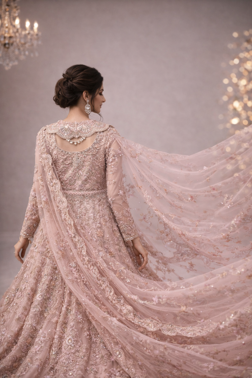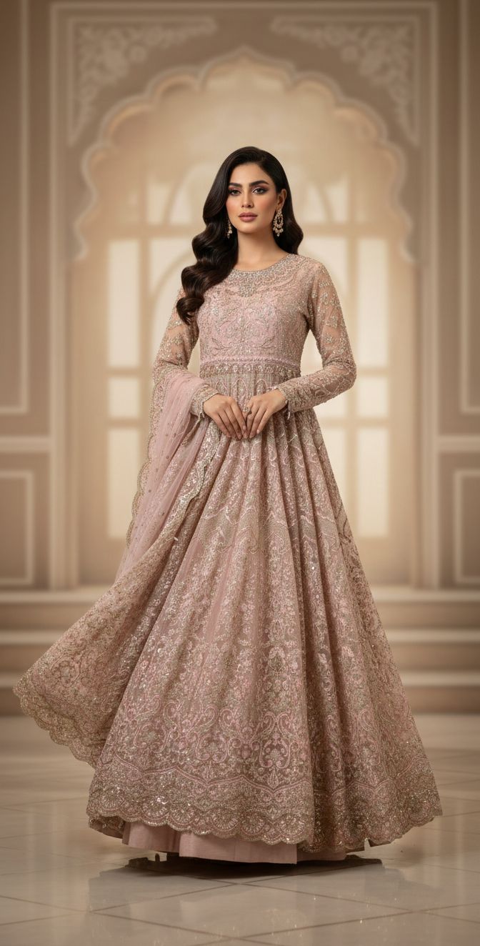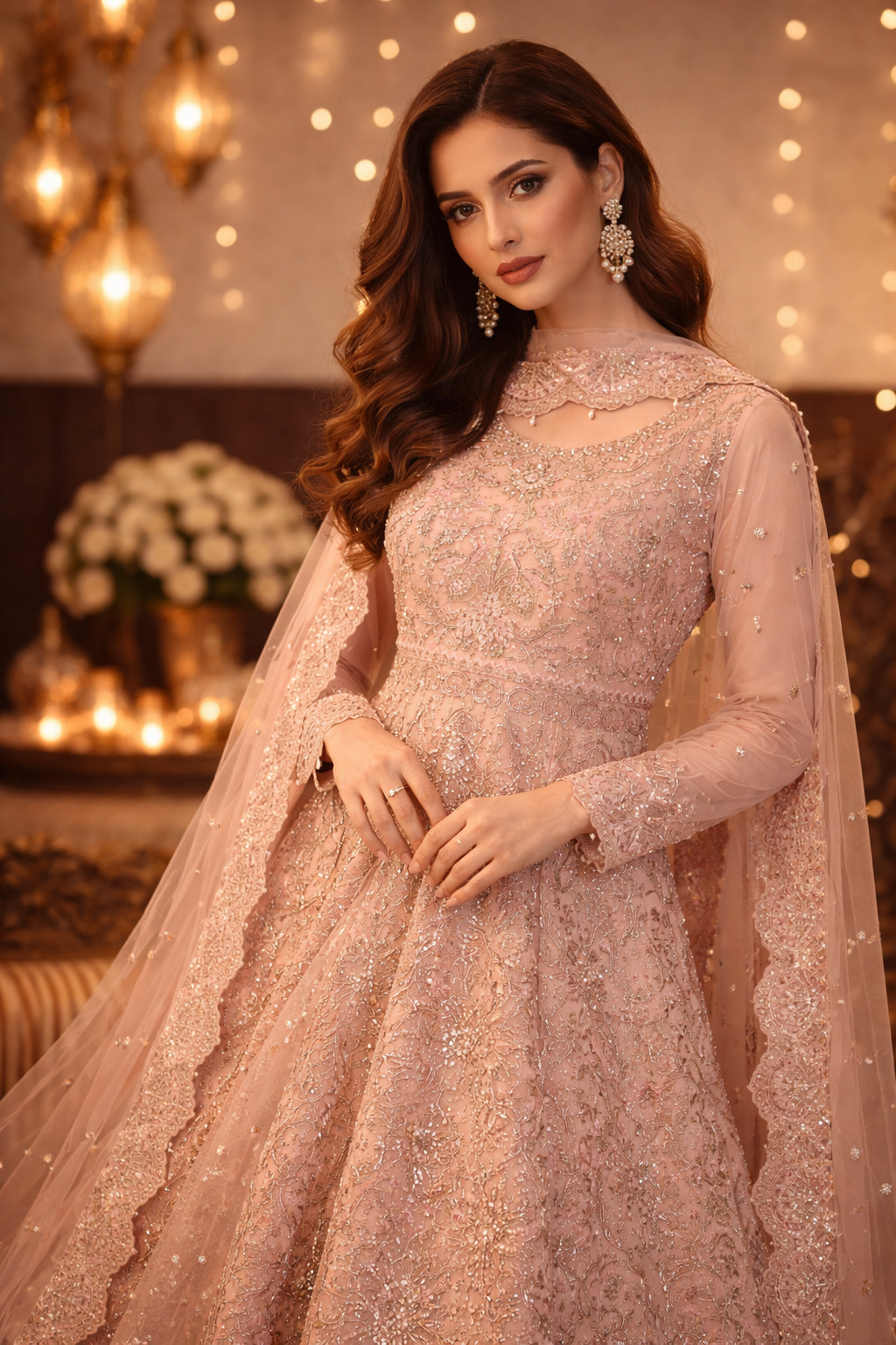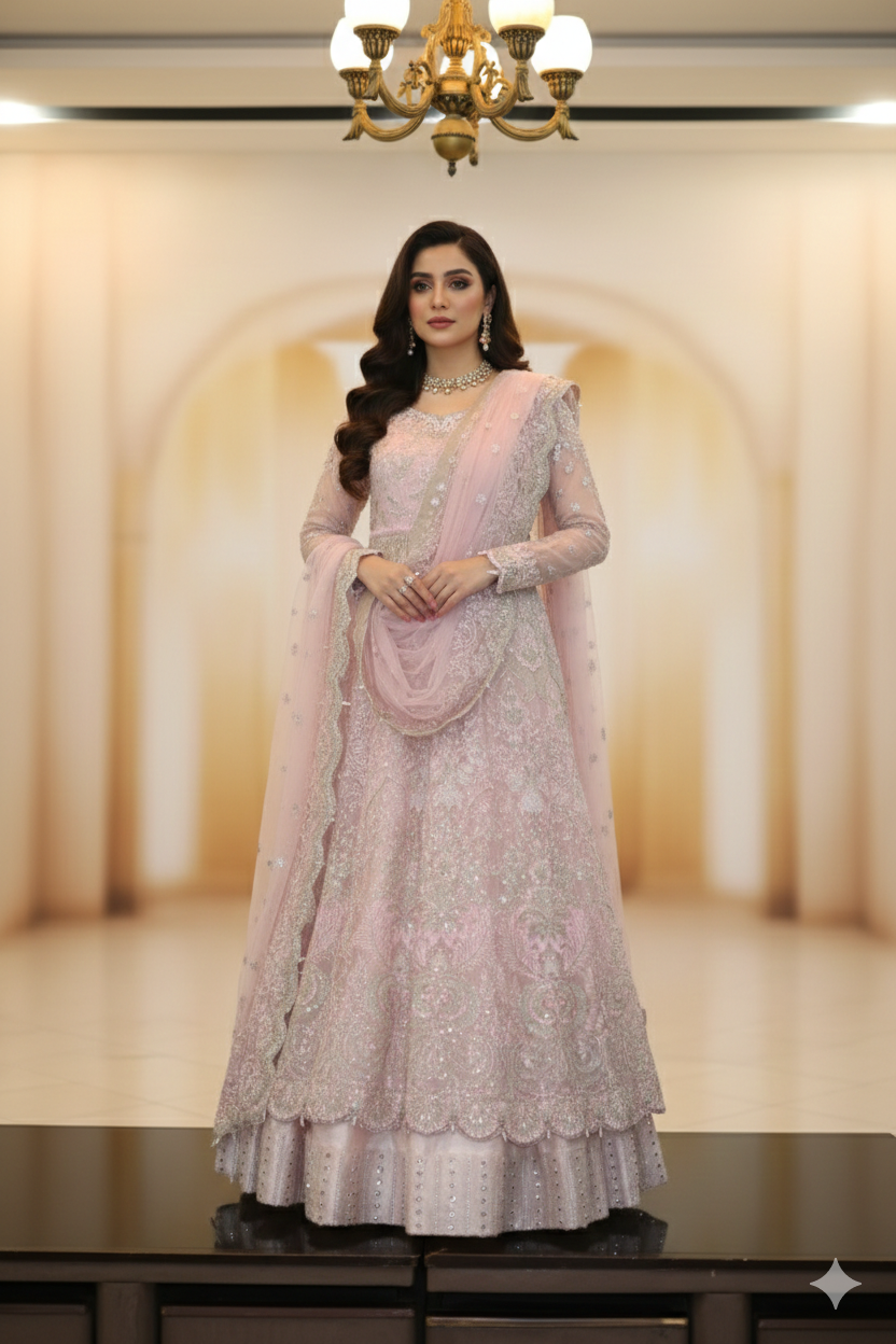 Indulge in the ethereal beauty of Airaé Blush, a breathtaking luxury formal ensemble designed to redefine regal elegance. This blush rose masterpiece is crafted on premium Bareeze Net, featuring intricate floral embroidery that cascades effortlessly over a structured silhouette.