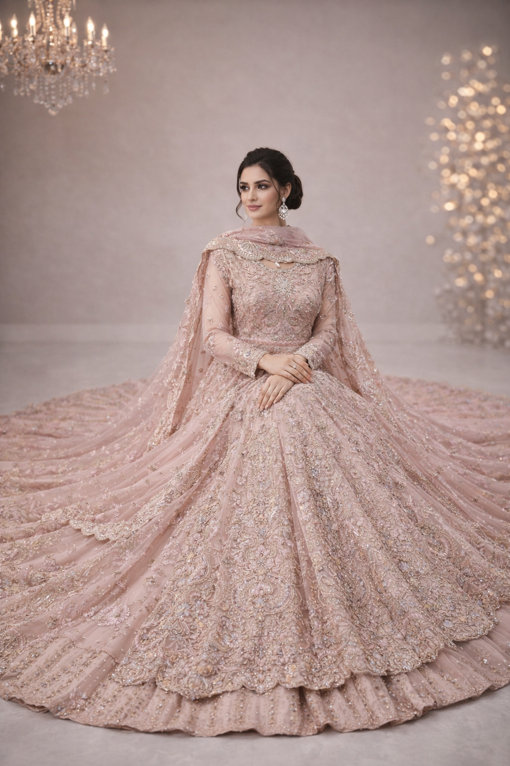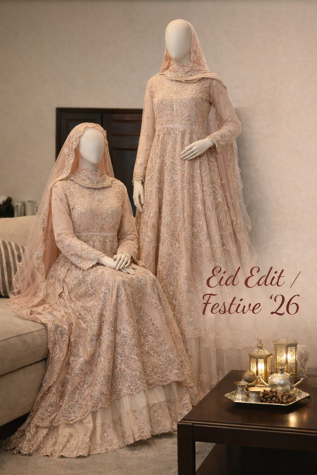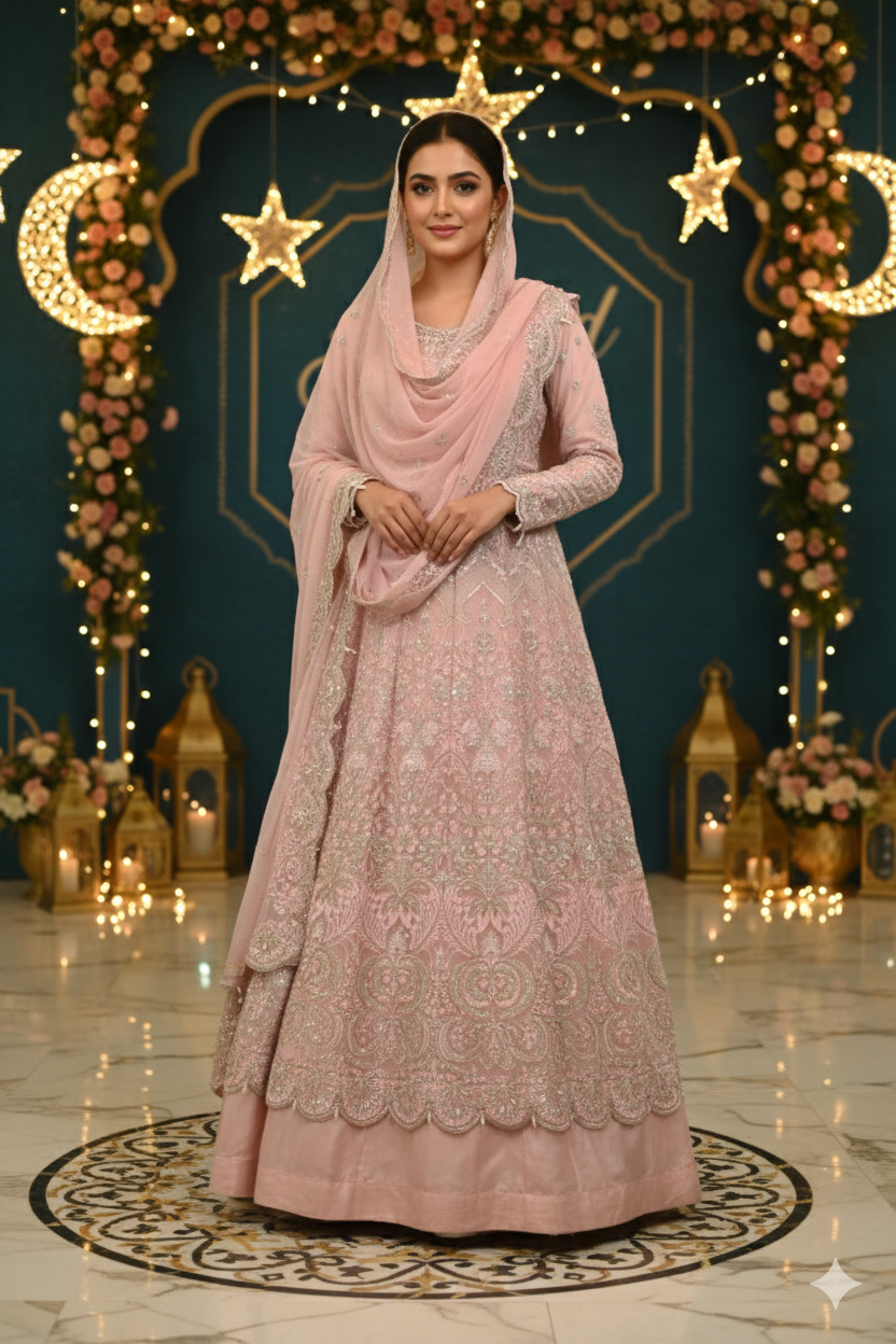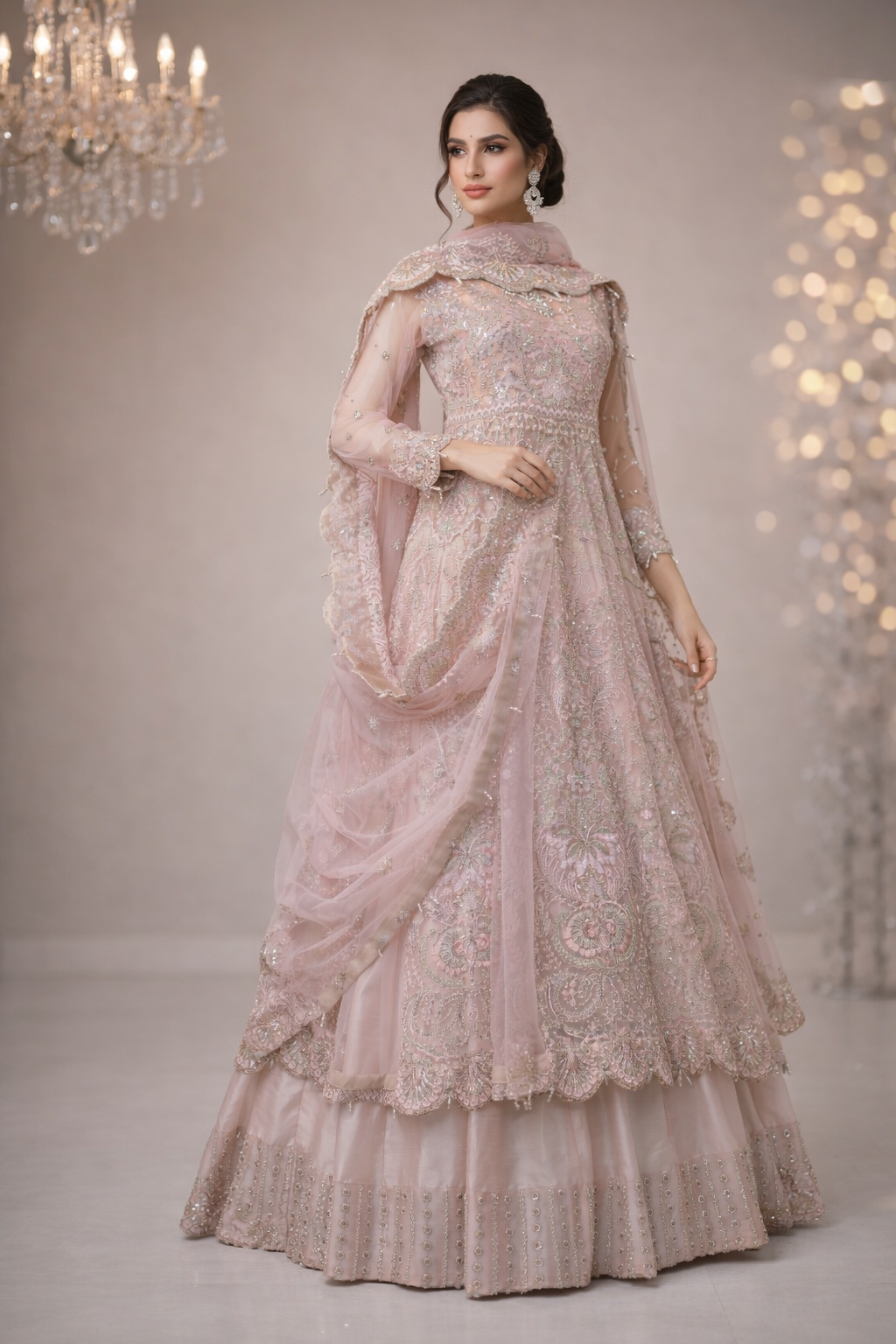 Indulge in the ethereal beauty of Airaé Blush, a breathtaking luxury formal ensemble designed to redefine regal elegance. This blush rose masterpiece is crafted on premium Bareeze Net, featuring intricate floral embroidery that cascades effortlessly over a structured silhouette.