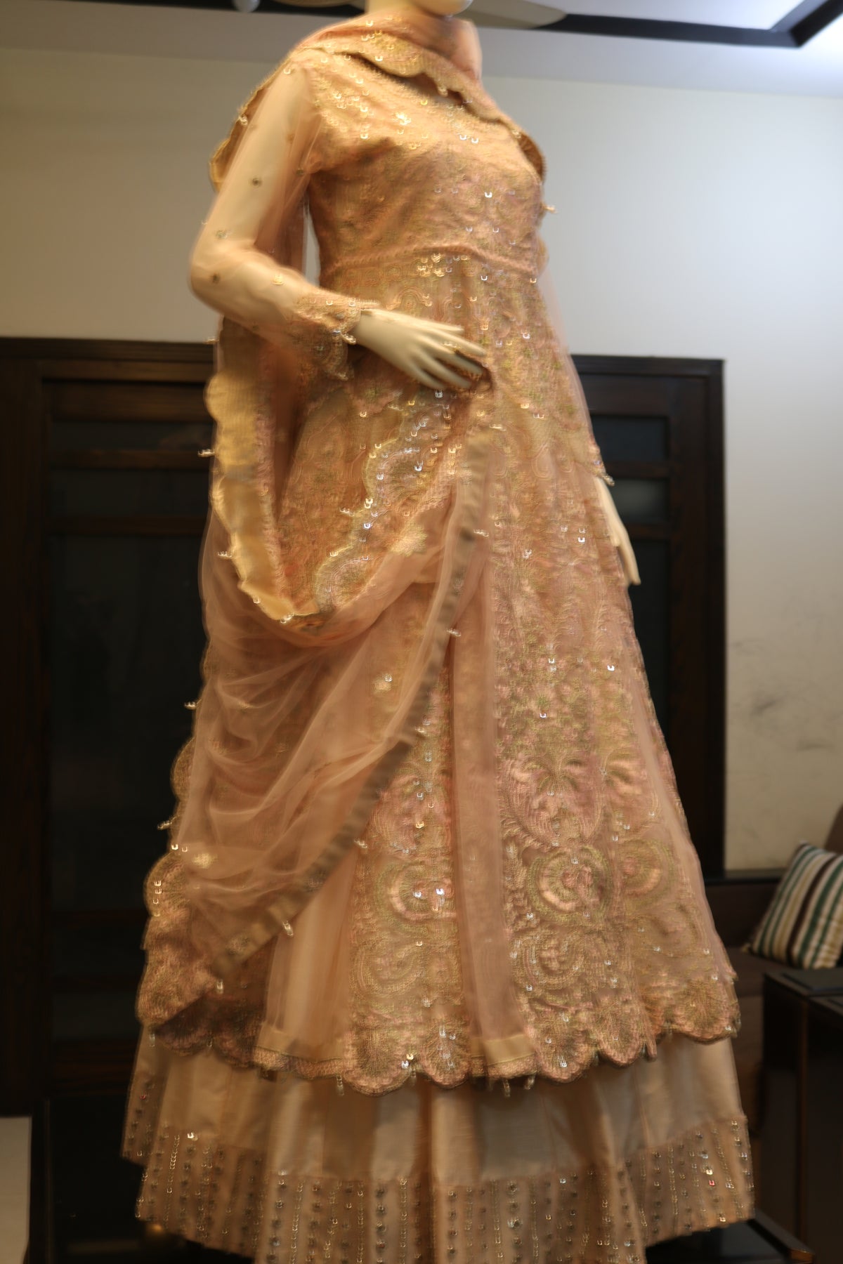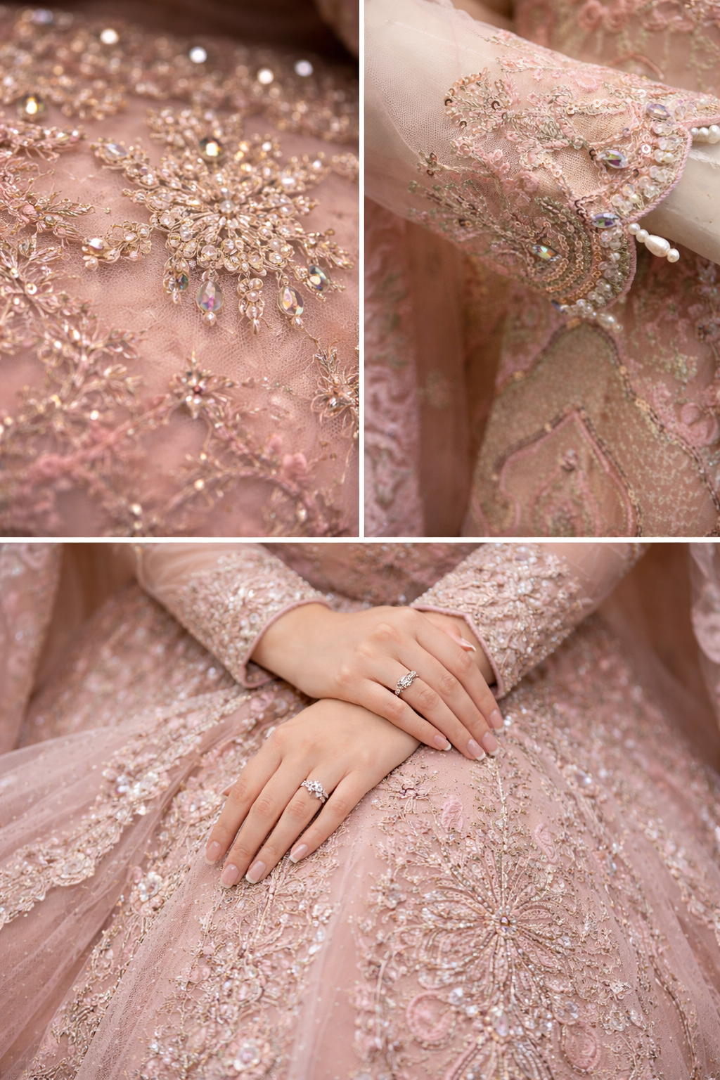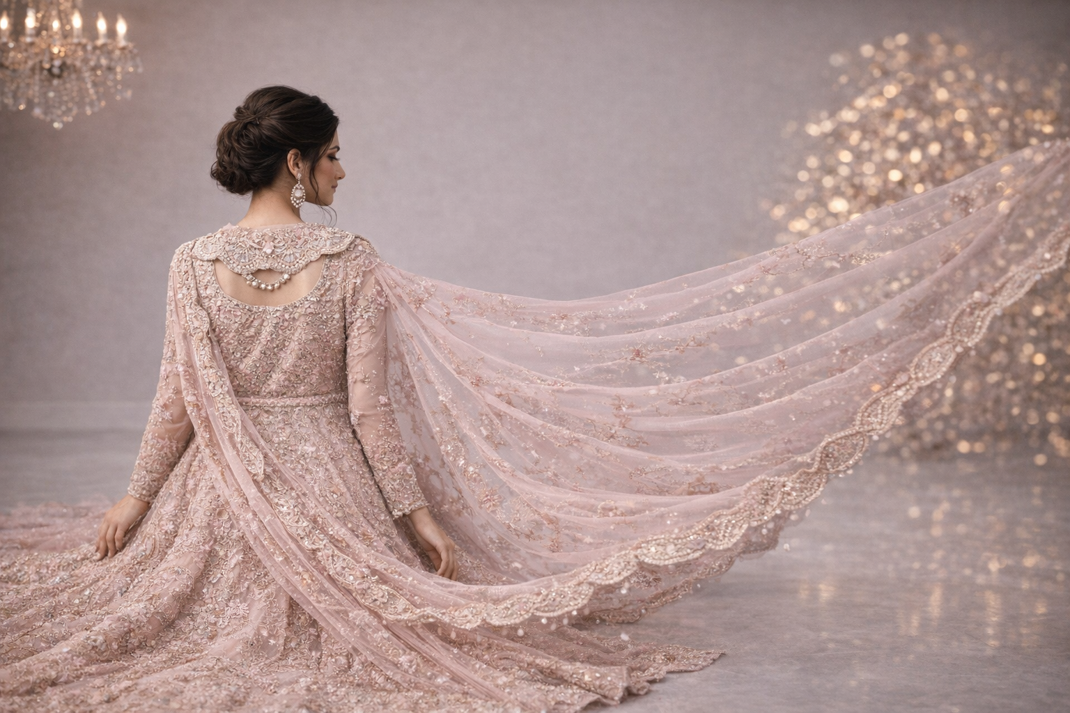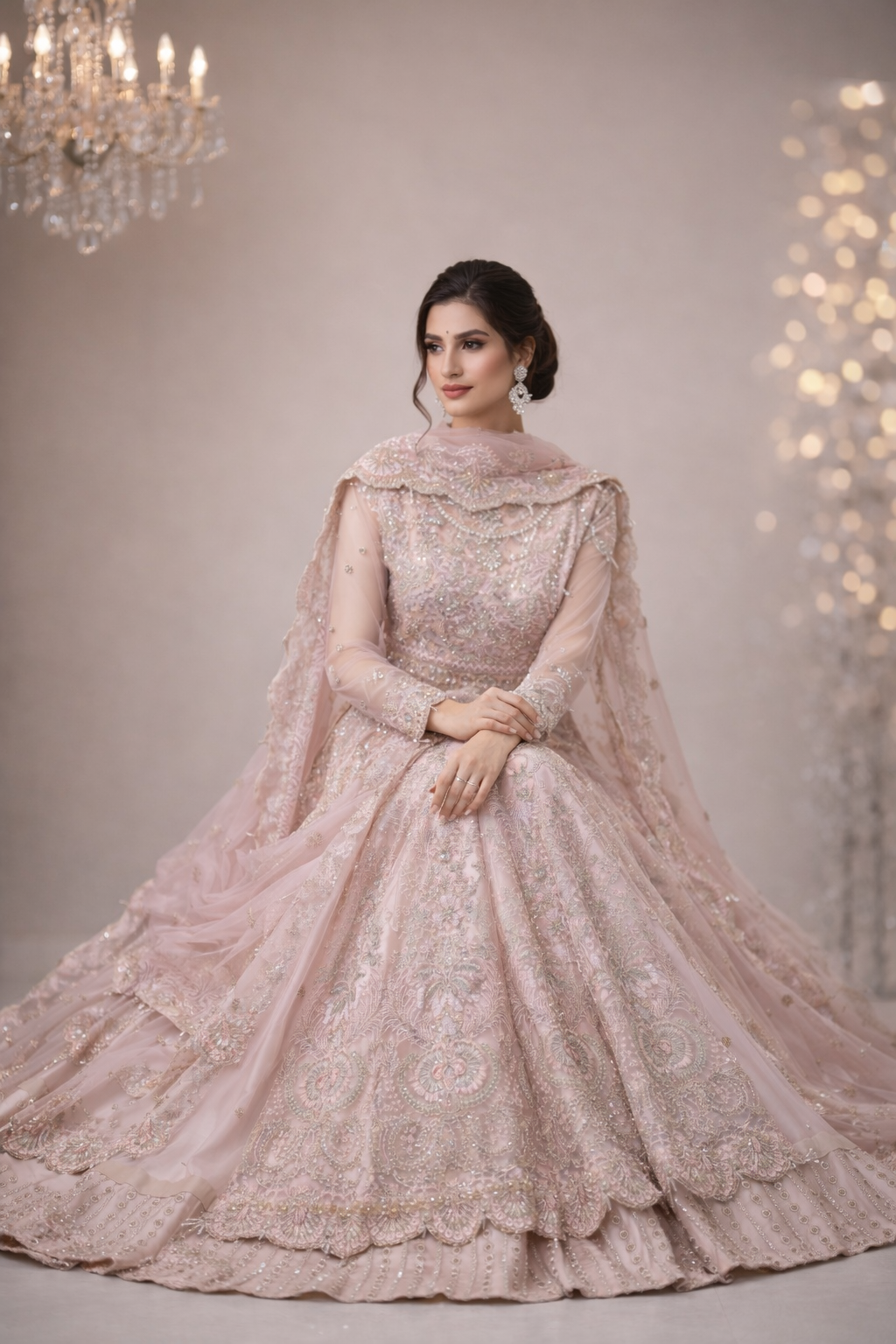 Indulge in the ethereal beauty of Airaé Blush, a breathtaking luxury formal ensemble designed to redefine regal elegance. This blush rose masterpiece is crafted on premium Bareeze Net, featuring intricate floral embroidery that cascades effortlessly over a structured silhouette.