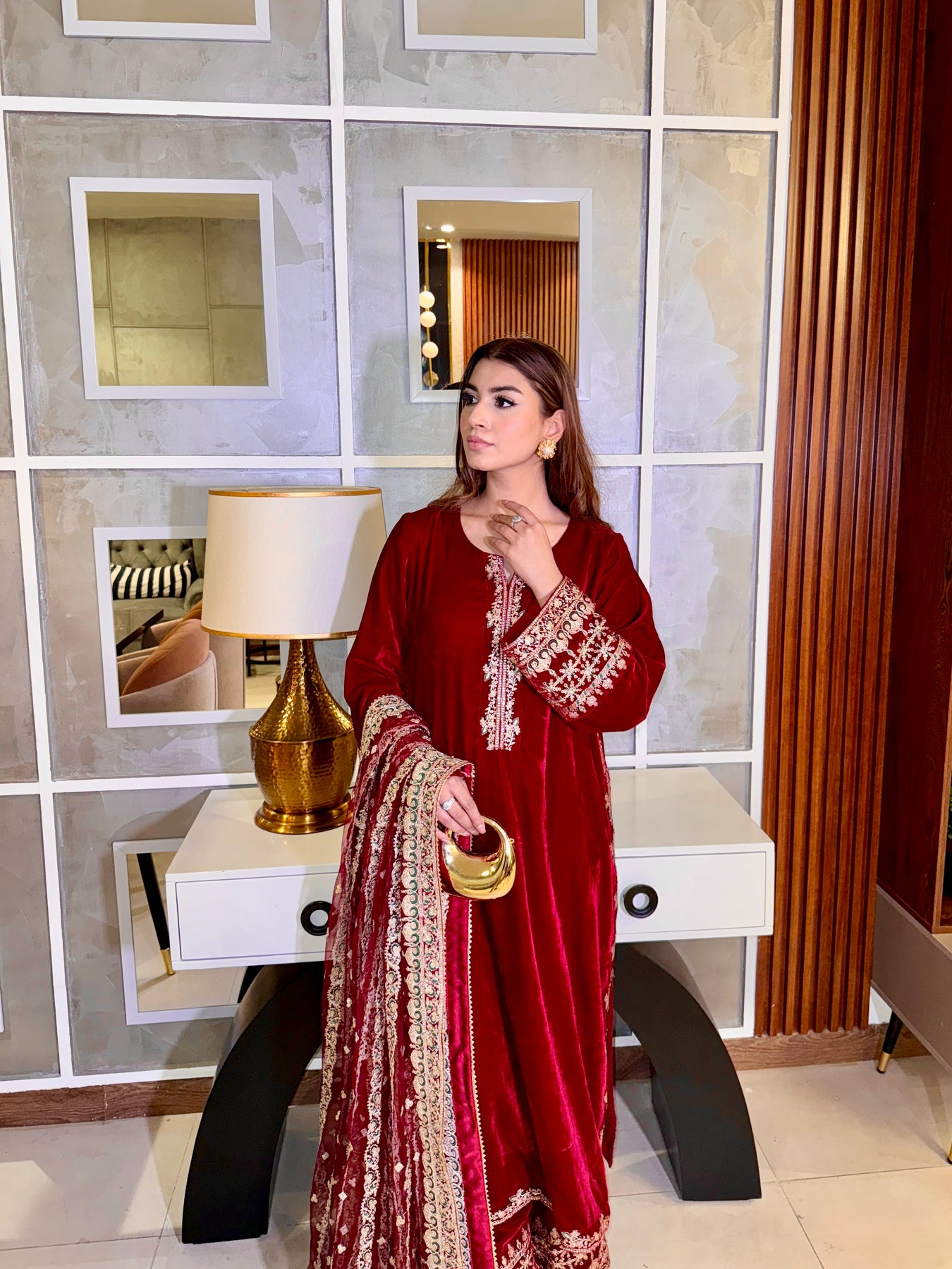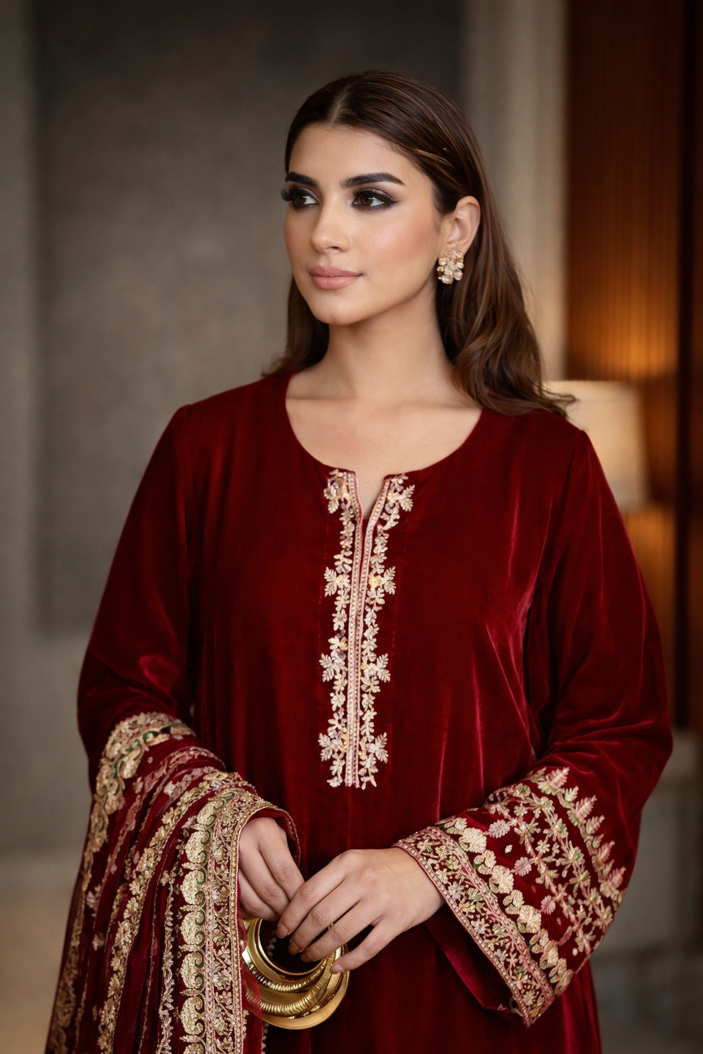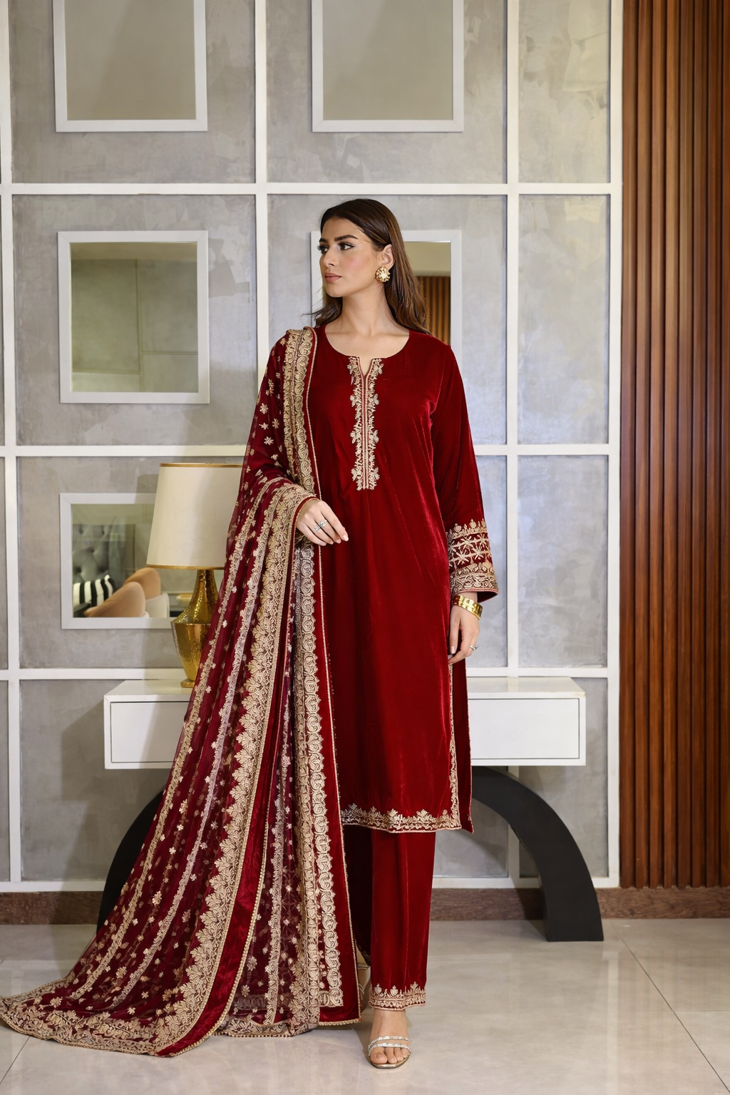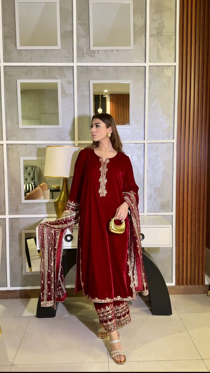A statement in luxury and allure, Gulnaar captures the true essence of festive sophistication. Crafted in rich maroon velvet, this three piece ensemble reflects meticulous craftsmanship and regal finesse. The shirt features delicate embroidery on the neckline, complemented by heavily adorned sleeves and a refined hemline.